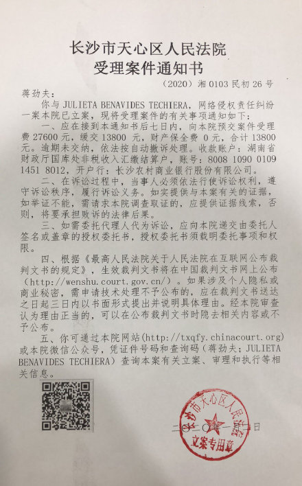 1月3日下午,蒋劲夫委托律师刘玥发表声明,称要起诉乌拉圭籍前女友Julieta。律师刘玥在其新浪微博发布案件受理通知书,称乌拉圭前女友Julie 更多