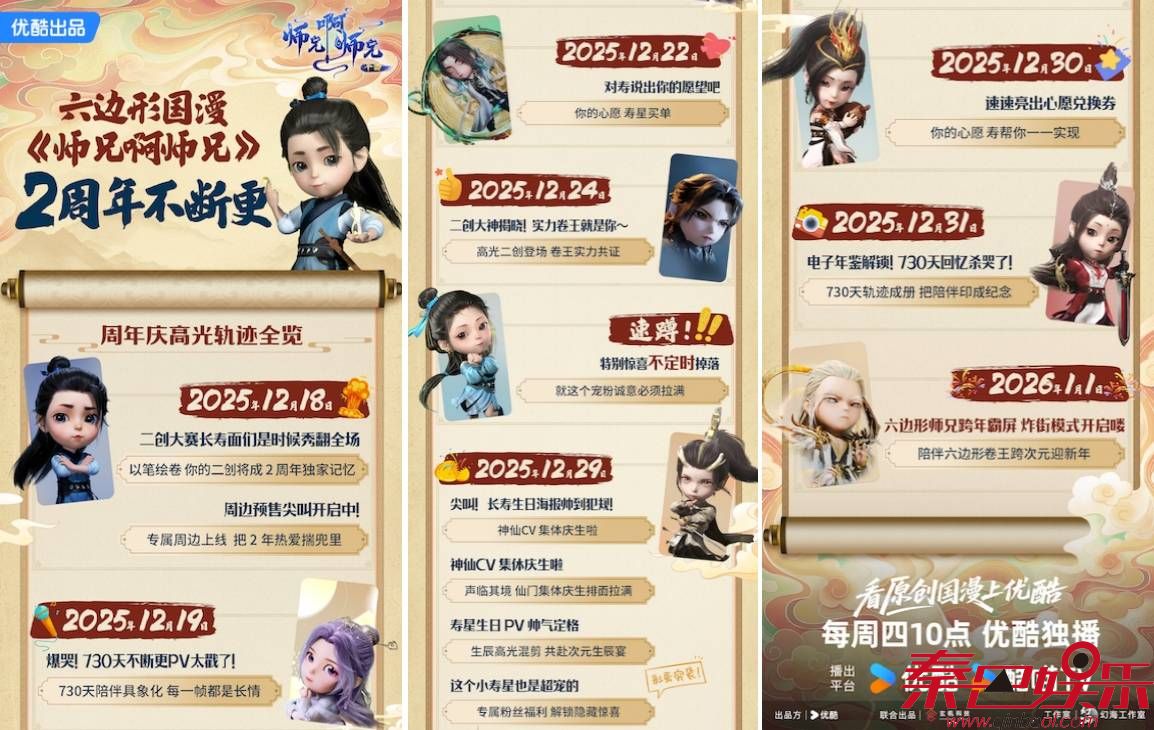 12月18日,《师兄啊师兄》正式开启两周年不断更庆典。一部动画能够实现 730 天稳定更新,背后既离不开制作团队精益求精的创作定力,更离不开粉丝群体长久以来的热忱支持。《师兄啊师兄》与粉丝并不是单纯的动画和观众的关系,两者一直以来都是执手共生的双向奔赴。本次两周年庆典,《师兄啊师兄》秉持着一贯宠粉的原则,在线上线下都做足了排面,不仅整理了以往粉丝二创的佳作,带领观众重温两年相伴的温暖记忆,也策划了跟粉丝面对面、满足粉丝心愿、全城霸屏共同跨年等诚意极强的互动。于《师兄啊师兄》而言,两周年的意义从来不止于一部动画的成长,更在于和粉丝共同度过的羁绊时光。而这份双向奔赴的情谊,也将成为作品持续前行的底气,陪伴观众走过未来的每一个周年。