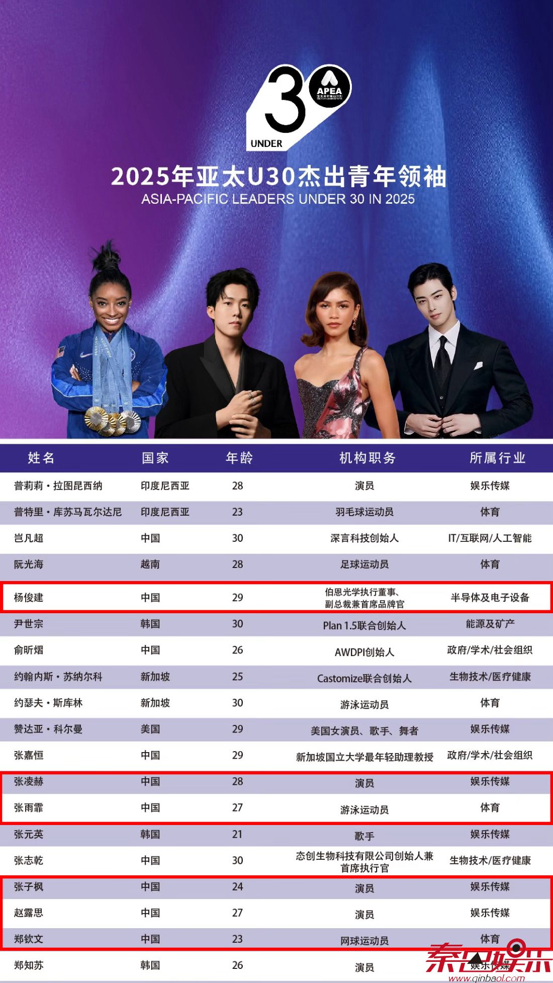 郑钦文、张子枫、赵露思、杨俊建等入选2025年亚太U30杰出青年领袖榜单