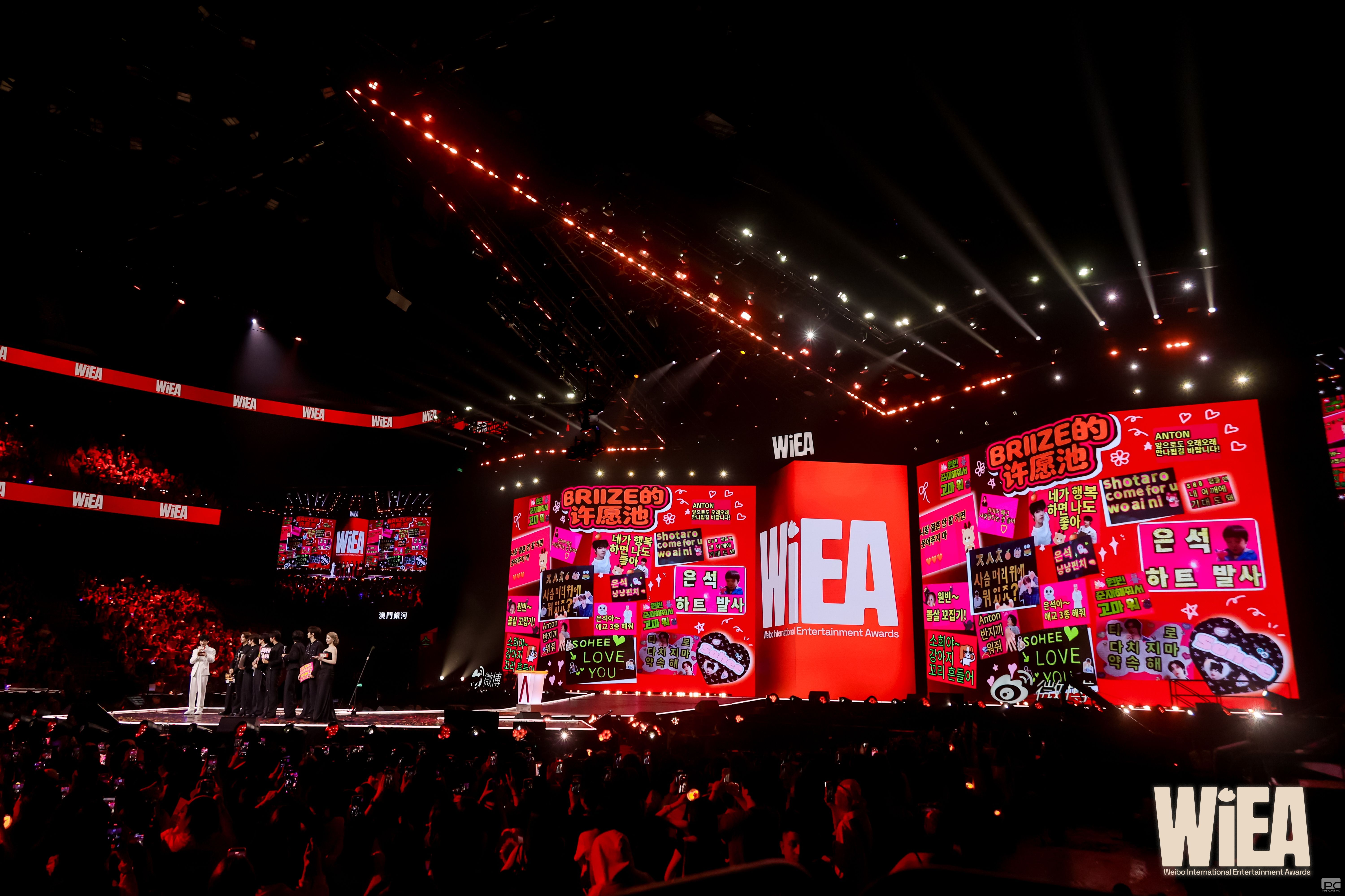 此外,WIEA心愿特派员赛博许愿神兽「喵娲娲小金」携粉丝心愿直通舞台,星粉跨屏互动引发现场持续沸腾。RIIZE六位成员依次完成来自粉丝的心愿饭撒牌挑战,现场尖叫声此起彼伏;PPKRIT分享想要尝试的角色挑战与畅想,谈及生日愿望称“想谈恋爱”逗翻全场;BILLKIN回答粉丝提问并透露将推出新专辑;演出当日恰逢朴宰范Jay Park生日,全场粉丝暖心祝福“生日快乐”;边伯贤(BAEKHYUN)重现微博爆梗名场面、完成“比小狗耳朵”等粉丝心愿;展轩完成粉丝专属提问互动,一句“但愿不负每一次相遇”感动全场,现场大屏呈现粉丝联名祝福留言并播放记录展轩与粉丝珍贵瞬间的专属视频,展轩现场落泪动容感谢粉丝,真挚的星粉奔赴温情满溢。